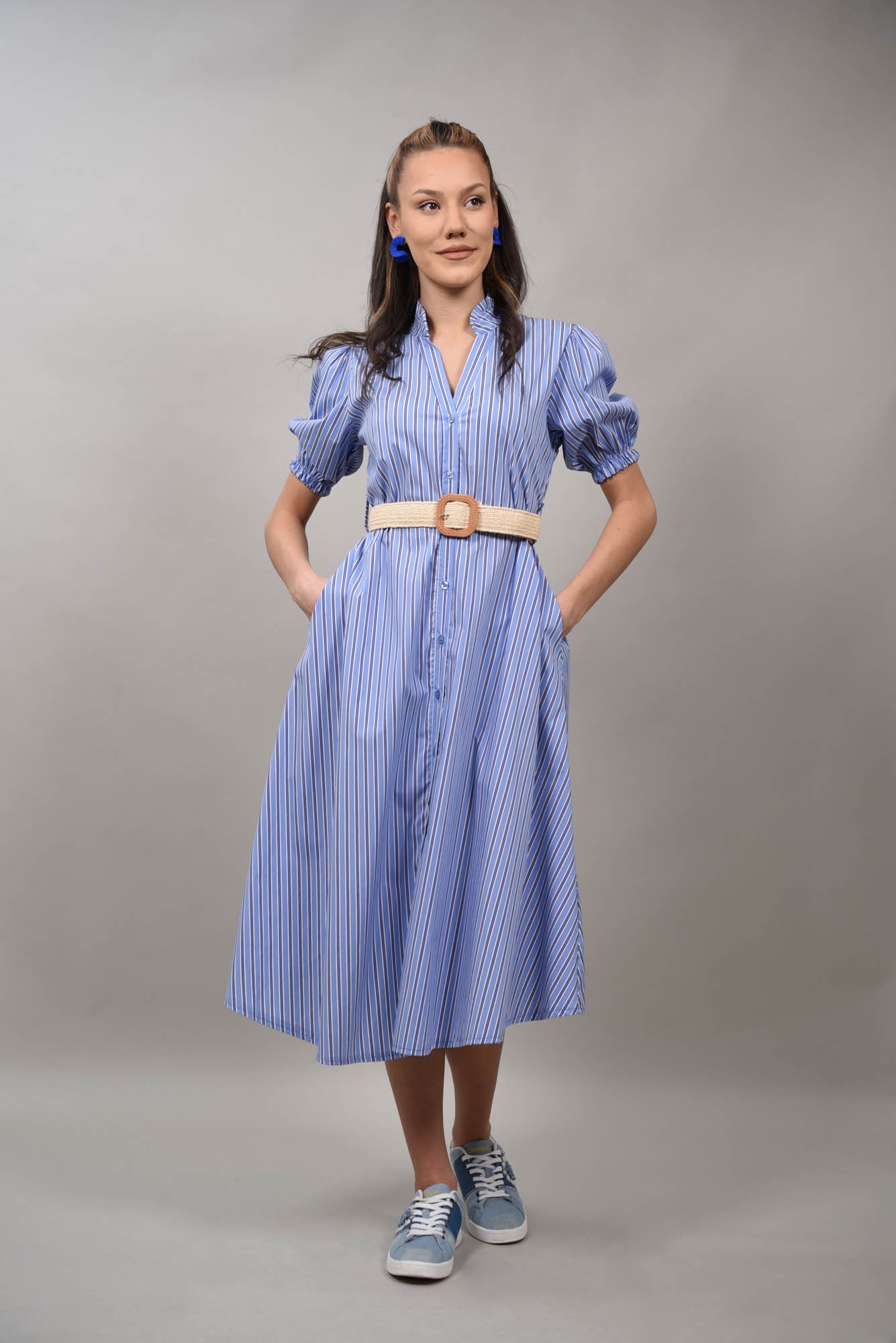 Experimentează eleganța cu Rochia Midi Tip Cămașă Zeffiretto. Disponibilă în nuanțele delicate de Baby Pink și Albastru. Mărimea unică, recomandată pentru XS-S-M, asigură potrivirea perfectă. Compoziția de 70% bumbac, 27% nylon și 3% elastan oferă confort și rafinament.
